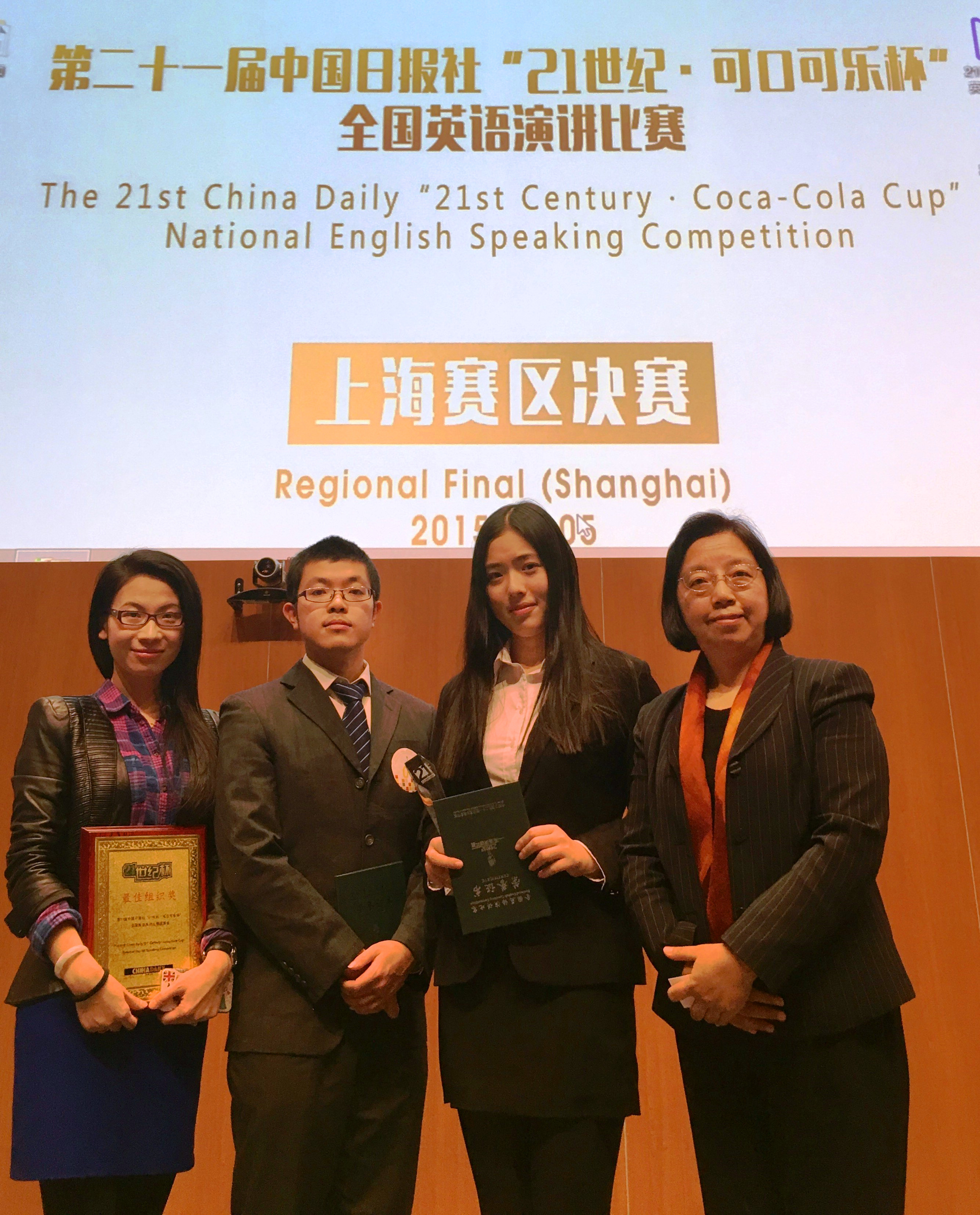 12月5日,由中国日报社和可口可乐大中华区联合主办,21世纪英语教育传媒、上海外文学会和纽约大学共同承办的“第21届中国日报‘21世纪·可口可乐杯’全国英语演讲比赛上海赛区总决赛在上海纽约大学举行。经过激烈争夺,最终,bwin必赢官网选手英124班的闻菁同学以漂亮的语音语调、精彩的演讲荣获此次赛事的冠军,上海交通大学和复旦大学的选手分别获得亚军和季军,他们将和获得第四名的上海纽约大学的选手一起,代表上海学子参加明年举行的全国总决赛。bwin必赢官网另一位选手英134班的袁湛同学也获得一等奖的佳绩。bwin必赢官网选手的指导教师是bwin必赢国际中国官方网站颜静兰教授和高攀老师。