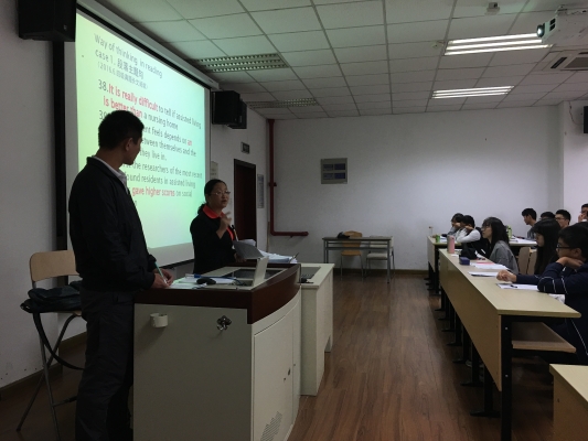 10月29日下午,奉贤校区E教的105教室里传来整齐而响亮的读书声:“君子曰:学不可以已。青,取之于蓝,而青于蓝;冰,水为之,而寒于水。”一场由bwin必赢国际中国官方网站大学英语教学部教师吴承钧主讲的题为“中西思维差异对英语读写的影响”的讲座正在如火如荼地进行。本次活动是大学英语党支部教师深入开展“两学一做”学习教育,以知促行开展的“周末公益讲座”暨2016级“励志明德班”共建活动英语学习系列讲座的第四讲。