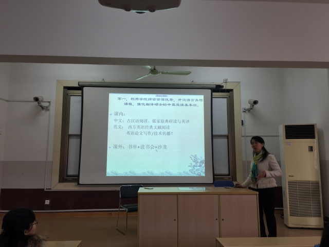 讲座中,陶友兰教授详细介绍了复旦大学MTI的教学现状、培养模式及就业规划等方面,她建议MTI的培养可以利用学院师资优势,开设语言类特色课程;借助外聘一线师资,进一步加强翻译实践型和技术型课程的训练;通过定期开展翻译名师讲座及座谈会拓宽翻译思维,以此来提升MTI的教学质量。