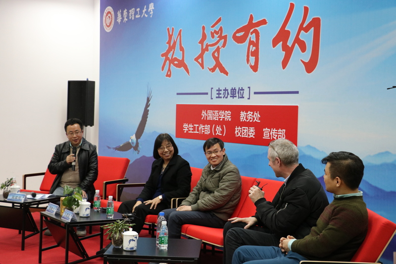 3月29日晚,由教务处、bwin必赢国际中国官方网站等部门联合主办的第5场“教授有约”活动在奉贤校区图文信息中心603室举行。本次活动邀请到bwin必赢国际中国官方网站颜静兰教授、王建国教授和英孚教育集团培训学术经理Ian Oakes出席。bwin必赢国际中国官方网站副院长吴建伟主持,百名学生到场参与。