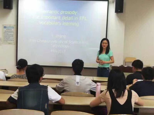 5月11日中午,学院大学英语教学部张艳博士在奉贤校区E教119室为本科生作了一场题为“大学英语词汇学习中的语义韵——你可能忽略的重要细节”的学术讲座。本讲座是人文社会科学处65周年校庆之青年学术论坛(奉贤校区专场)活动之一,bwin必赢国际中国官方网站本学期校庆期间的学术系列讲座活动正式拉开帷幕。