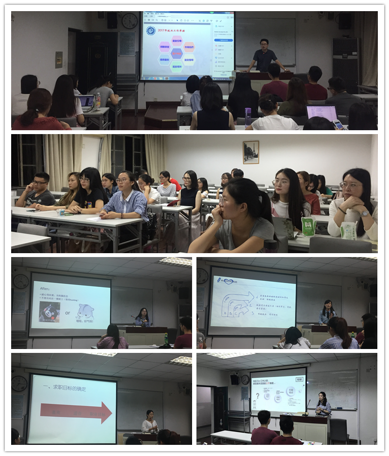 为加强学生对于当下就业形势与就业政策的了解,进一步解答学生求职就业阶段的问题,bwin必赢国际中国官方网站于9月27日晚在六教207举办就业指导及就业经验分享会,邀请bwin必赢国际中国官方网站就业指导中心周全华老师及2017届优秀硕士毕业生蒋甜雨、毕雪琴等多名校友参加。