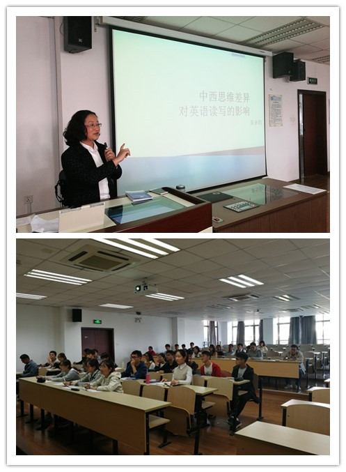 吴老师以李小龙讲述功夫与道家的水的哲学之关系为开篇,类比了英语的工具性与思维学习的重要性,从而引导学生注重语言学习中西方思维的差异。进而,她从四级长文阅读和学生习作中存在的问题出发,引入“中西思维差异对英语读写的影响”的主题。吴老师还以中西经典名篇荀子的《劝学》和培根的《论学习》为载体,从螺旋与直线,求同与求异,意向与实证等方面阐述了两篇文章的差异。在此基础上,吴老师以学生泛读课文”Is love an art?”为例,指导学生从篇章、段落模式结构和词汇层面对英文的直线型行文特点进行了构图训练。吴老师在讲座中还强调,在中西思维的碰撞中保持对世界的好奇心,是保持英语长久性学习的动力所在。