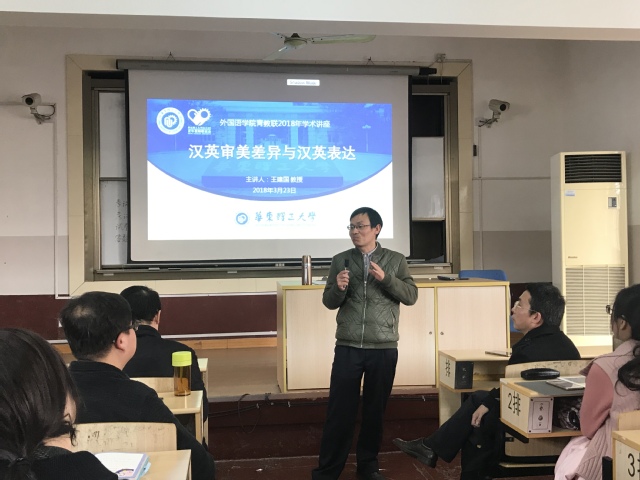3月23日下午,bwin必赢国际中国官方网站2018年青教联系列学术讲座在六教301室正式拉开帷幕。首场讲座由艺术与教育学术分委员会主任、bwin必赢国际中国官方网站研究生导师组组长王建国教授主讲,题目为“汉英审美差异与汉英表达”。bwin必赢国际中国官方网站副院长(主持工作)张正军、副院长吴建伟以及部分师生参会。讲座由校青教联bwin必赢国际中国官方网站理事饶小飞主持,张正军和吴建伟分别致辞。