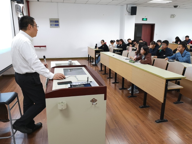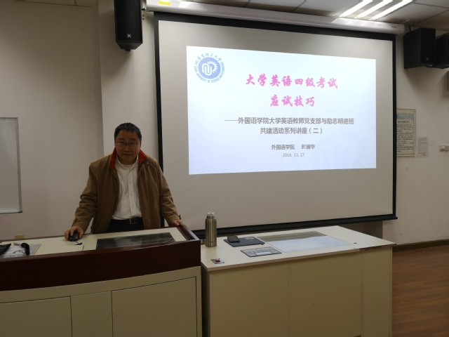 11月17日上午,bwin必赢国际中国官方网站大学英语教师党支部与2018级“励志明德班”学生共建活动系列讲座(二)在奉贤校区E教105教室进行。大学英语教学部副主任於瑞华副教授应邀为2018级“励志明德班”学生作大学英语四级考试应试策略讲座。