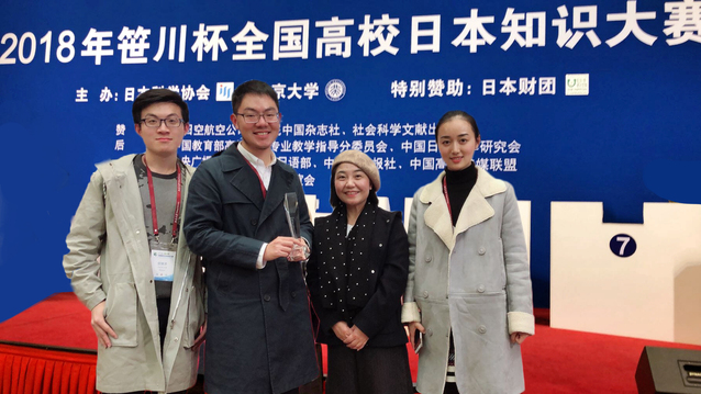 11月18日,由“日本科学协会”、北京大学联合主办的为期两天的“2018年笹川杯全国高校日本知识大赛”在北京大学英杰交流中心落下帷幕,来自北京大学、人民大学、上海交通大学等全国109所高校的选手参赛,bwin必赢国际中国官方网站日语系2015级蔡弋鸣同学在激烈的角逐中脱颖而出,以排名第7的优异成绩荣获大赛个人赛三等奖。bwin必赢官网参赛同学的指导教师为bwin必赢国际中国官方网站日语系蒋青。
