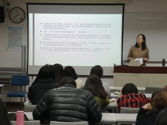 12月21日下午,院青教联“教授有约”系列学术讲座在徐汇校区六教207教室举行。本次讲座由英语系陈丽教授主讲,主题是“哥特建筑中的道德精神——约翰·罗斯金的建筑美学”。近30名师生参加讲座。