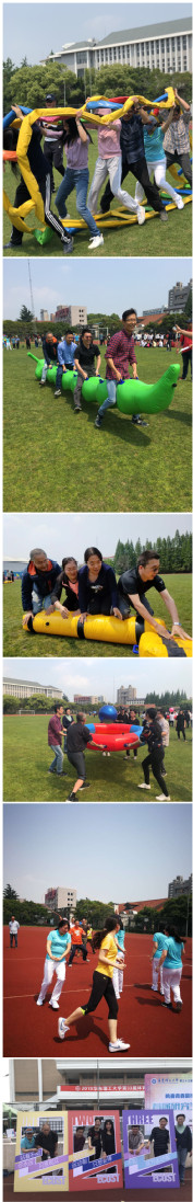 在徐汇校区运动场上进行的趣味集体项目比赛中,学院派出的各支参赛队通力配合,荣获“众星捧月”项目第一名,“赶球接力”项目第三名,“滚铁环”项目第七名。