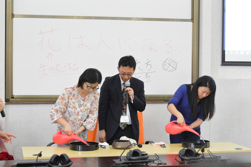 高桥教授还现场指导两位听众动手体验草月流的插花技巧,以玫瑰花等花材打造了一尊富有法国宫廷浪漫气息的插花作品,赢得了在座师生的满堂喝彩。