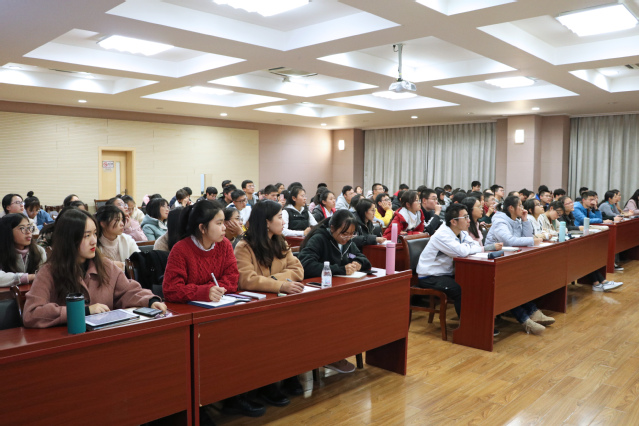 12月9日晚,bwin必赢国际中国官方网站大学英语教师党支部与2019级“励志明德班”学生共建活动系列第二讲在大学生活动中心419教室开讲。大学英语教学部副主任於瑞华副教授应邀为2019级“励志明德班”学生作“大学英语课程学习与学业考试”讲座,现场座无虚席,楼燕斐主持讲座。