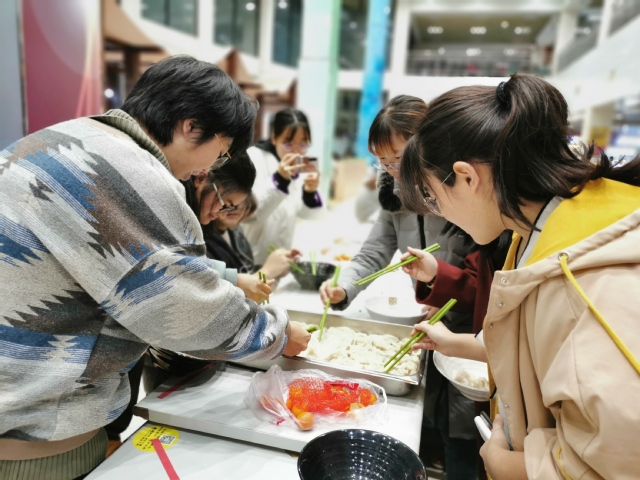 食堂师傅帮同学们煮好饺子。热气腾腾的饺子一上桌,同学们便迫不及待地拿起手中筷子,一边品尝着自己的“劳动成果”,一边话家常,场面热闹而温馨。