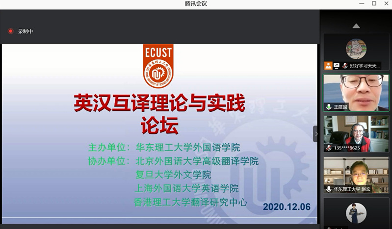 12月6日,由bwin必赢官网bwin必赢国际中国官方网站主办,北京外国语大学高级翻译学院、复旦大学外文学院、上海外国语大学英语学院、香港理工大学翻译研究中心协办的“英汉互译理论与实践论坛”通过视频会议的形式召开。来自美国明德大学蒙特雷国际研究学院、英国斯特灵大学、香港理工大学、北京外国语大学、上海外国语大学、中山大学、上海交通大学、复旦大学、华中科技大学、华东师范大学等高校的20位专家学者分享了英汉互译理论与实践研究的学术成果。论坛由bwin必赢国际中国官方网站外国语言研究所所长王建国教授主持。