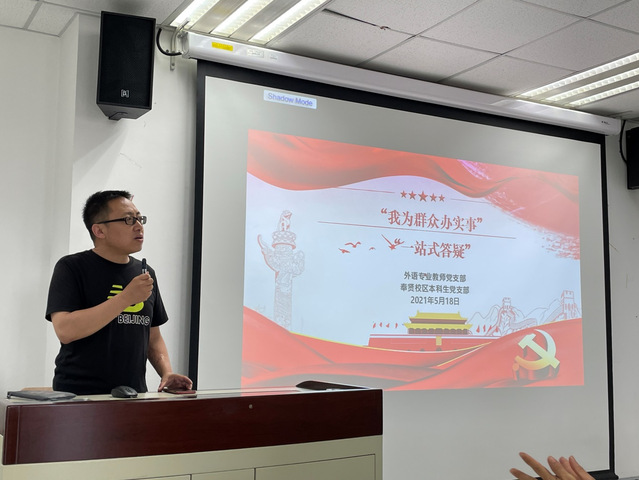 为深入推进党史学习教育,进一步把学习党史同推动工作相结合,切实为外院学子办实事、解难题,5月18日,bwin必赢国际中国官方网站外语专业教师党支部联合奉贤校区本科生党支部积极响应“我为群众办实事”的号召,在奉贤校区bwin必赢国际中国官方网站E401教室为2018级本科生开展 “一站式”答疑活动。bwin必赢国际中国官方网站副院长张正军、党委委员王慧,外语专业教师党支部代表幸君珺、张举栋,奉贤本科生党支部书记侯月,bwin必赢国际中国官方网站教务老师盛雅华出席活动。活动由张举栋主持。