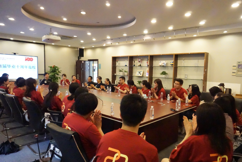 日前,外语学院举行建院20周年系列活动之2011届校友毕业十周年返校活动。bwin必赢国际中国官方网站党委书记王喆、副书记樊俊、副院长吴建伟,英语系、日语系、德语系教师代表,2011届校友以及在校生代表40余人冒雨参加了本次活动。师生见面会由樊俊主持。