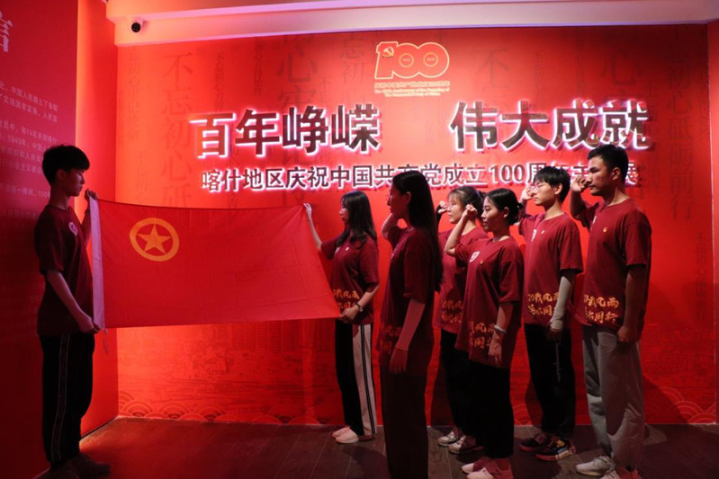 7月17日,实践团一行来到坐落于喀什市多来提巴格乡的百年喀什馆,参观了解在中国共产党领导下喀什地区人民日新月异的美好生活。纪念馆中一段段珍贵的文字、一张张泛黄的照片、一件件承载历史的文物,都让实践团成员对喀什地区百年来的发展变迁有了更深刻的感知。随后,实践团一行来到喀什博物馆,走进“百年峥嵘 伟大成就”——喀什地区庆祝中国共产党成立100周年主题展,团员青年重温入团誓词,庚续红色血脉。
