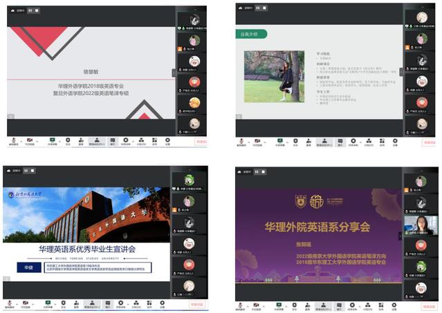复旦大学英语笔译专业硕士研究生骆慧敏围绕研究生考试备考、专四备考、毕业论文写作分享了丰富的经验;华东师范大学翻译系英语笔译专业硕士研究生江薇分享了其在课程学习、科研项目、评奖评优以及学生工作等方面的经验体会;北京外国语大学英语语言及应用语言学专业硕士研究生申健与同学们分享了其在北外学习的心路历程与感受,并鼓励大家敢于直面挫折;南京大学英语笔译专业硕士研究生张郭瑶结合自己本科阶段在科研竞赛、学生工作、求职实习等方面的经历,为同学们提供了职业生涯规划上的帮助与指导。