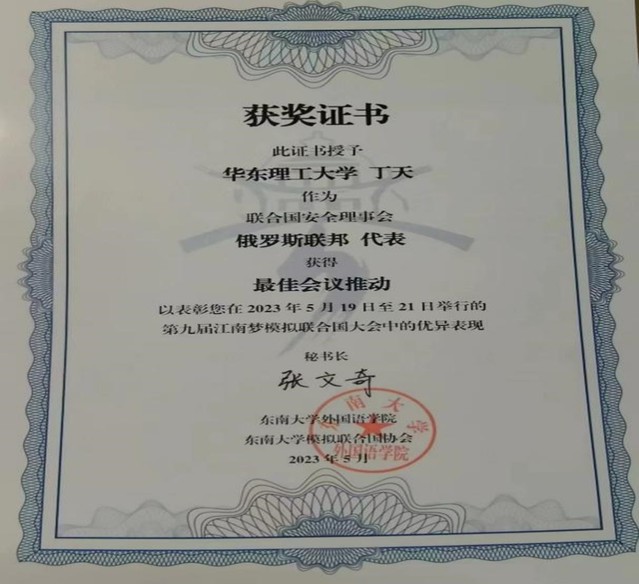 5月19日,bwin必赢官网商学院信息管理与信息系统专业二年级学生丁天同学代表学校应邀参赛东南大学第九届江南梦模拟联合国大会,与来自东南大学、南京大学、南京航空航天大学、扬州大学等高校80余位代表和学术团队成员参会。此次他模拟俄罗斯联邦驻安理会代表的身份,深入研究纳卡地区冲突的起源、冲突双方存在的宗教分歧等因素,提出了向纳卡地区派驻维和部队、建立冲突双方的谈判平台和对话机制等解决方案,促成了一系列决议的通过,有力推动了会议进程,最终获评“最佳会议推动奖项”。