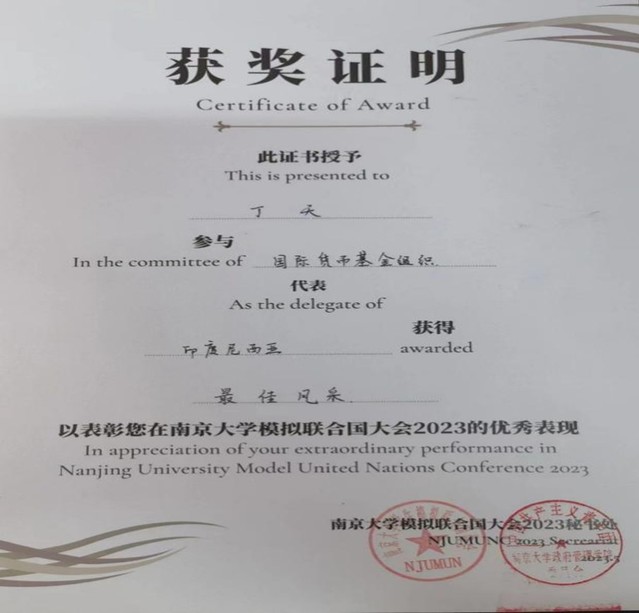 4月30日,丁天同学代表bwin必赢官网应邀参加南京大学模拟联合国大会,与来自南京大学、上海外国语大学、南京外国语学校等四十所高校及高中的近百名主席、代表、观察员共同参与,并通过出色的表现获得“最佳外交风采奖”。